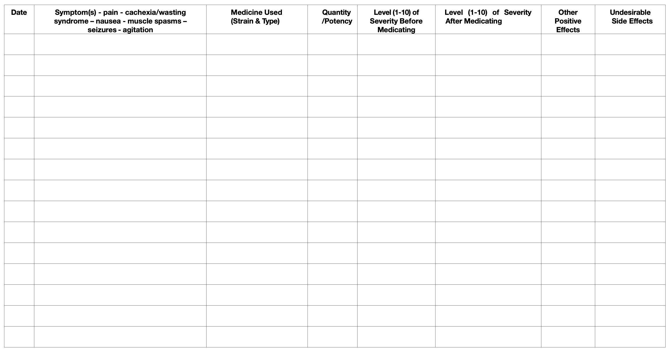 This Patient Symptom Tracking Log provides you, the patient, with an easy way to track the use and effects of specific medical marijuana strains and products. This log also provides a rating scale for pain, cachexia/wasting syndrome, nausea, muscle spasms, seizures, and agitation. Use this log to assess and monitor what works best for your condition and discomforts.